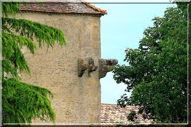 * Derrière les arbres avec un imposant toit pentu cette curieuse construction est le logis avec son donjon habitable. A l'arrière, le bâtiment possède des consoles ayant certainement porté une bretèche (voir vocabulaire).